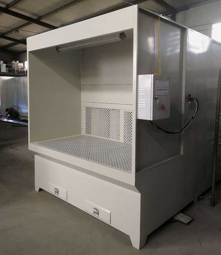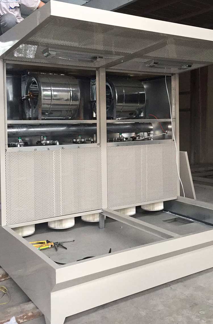 多工位打磨吸塵工作臺(tái)工作時(shí),把工件放在工作臺(tái)面上打磨,在排風(fēng)機(jī)的抽吸作用下,將工件上打磨出來的粉塵、灰塵等物吸入機(jī)內(nèi),打磨出來的粉塵不會(huì)在操作者的呼吸處停留,而隨抽風(fēng)的氣流迅速抽進(jìn)主機(jī)里,帶有粉塵的氣流通過百味窗透過濾芯排風(fēng)過濾系統(tǒng)流向機(jī)外,粉塵顆粒經(jīng)過濾芯過濾后掉下主機(jī)的集成箱里,干凈的空氣排出。還有一部分氣體通過回風(fēng)道經(jīng)過風(fēng)口棉,再次過濾吹到工作臺(tái)面,從而達(dá)到循環(huán)的***佳效果。這樣大大改善了工作環(huán)境。