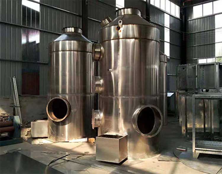 生產(chǎn)設(shè)備運(yùn)行過(guò)程中產(chǎn)生的廢氣通過(guò)管道由風(fēng)機(jī)引入不銹鋼噴淋塔,在噴淋塔內(nèi)多級(jí)噴淋的混流作用下,廢氣與塔體噴出的吸收液充分接觸。噴漆,SO2和NOx等有機(jī)廢氣被吸收液吸收,而廢氣和粉塵在離心力的作用下被甩到塔壁,被塔體內(nèi)壁的水膜粘附,然后隨吸收液流入沉淀池,定期清洗。凈化后的氣體經(jīng)氣體除霧層進(jìn)行氣液分離后,從高空煙囪排入大氣。