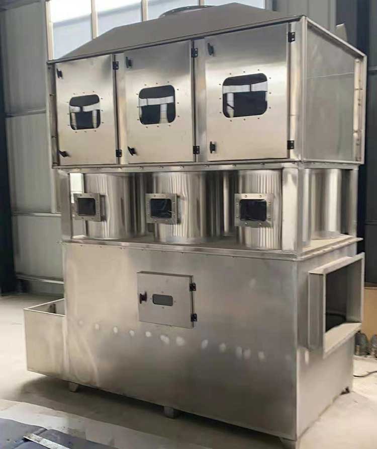 2、旋流板除塵塔內(nèi)安裝有多個“圓形旋流桶”和高效除霧板。旋流桶內(nèi)放有實心填料球,用來凈化粉塵或粘性廢氣,***上層的除霧板用來凈化水霧,達到去除水霧的目的,經(jīng)引風機引入的廢氣在塔內(nèi)旋流上升、并在各板上與由塔頂進入的液體旋流接觸,完成除塵、脫硫任務(wù)。旋流板塔在離心力的作用下,煙氣中的顆粒物沉入水池, ***后由人工撈出清理,同時塔內(nèi)的水可以繼續(xù)循環(huán)使用,不會造成污染。經(jīng)過凈化的廢氣,再經(jīng)過后繼凈化設(shè)備處理,使之達到國家排放標準。