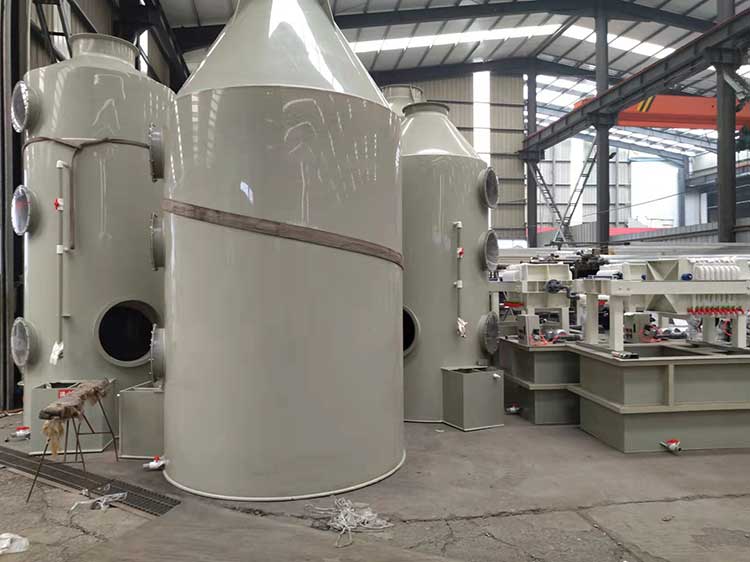 噴淋塔廢氣處理塔處理廢氣的方式如下,廢氣塔在運行中,不斷有機氣體由風管引入噴淋塔,經過填料層,廢氣與漆霧凝聚劑的稀釋劑進行氣液兩相充分接觸吸收中和反應,有機氣體經過凈化后,再經除霧板脫水除霧后由風機排入大氣。吸收液在塔底經水泵增壓后在塔頂噴淋而下,較后回流至塔底循環使用。凈化后的有機氣體中,漆霧去除率達到95%以上,為后續處理噴漆廢氣中的甲苯,二甲苯等有機氣體提供良好工作條件。