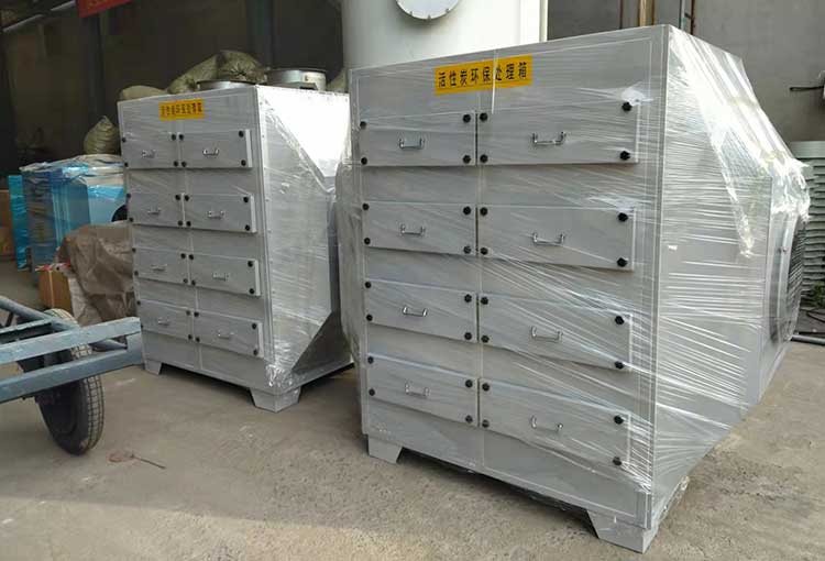 活性炭吸附設備配置如下:L2.5*W1.15*H1.3(m),1.0mm鍍鋅板制作,外表噴塑。共6個活性炭抽屜,240塊(L10*W10*H10)活性炭磚。進風口一道玻纖過濾網,出風口一道活性炭過濾棉。活性炭碘值400。
