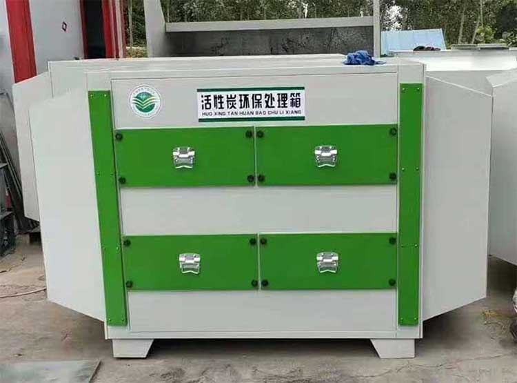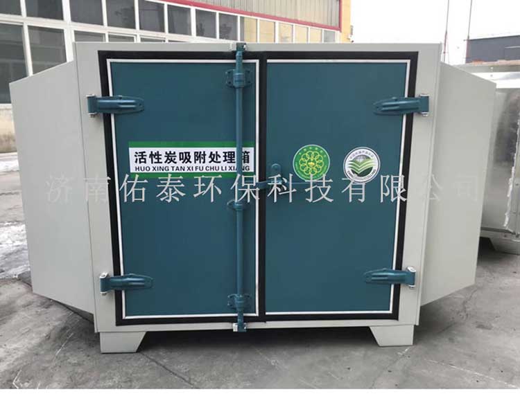 當廢氣由風機提供動力,負壓進入環保箱后進入活性炭吸附層,由于活性炭吸附劑表面上存在著未平衡和未飽和的分子引力或化學鍵力,因此當活性炭吸附劑的表面與氣體接觸時,就能吸引氣體分子,使其濃聚并保持在活性炭表面,此現象稱為吸附。利用活性炭吸附劑表面的吸附能力,使廢氣與大表面的多孔性活性炭吸附劑相接觸,廢氣中的污染物被吸附在活性炭表面上,使其與氣體混合物分離,凈化后的氣體高空排放。活性炭環保箱是一種干式廢氣處理設備,由箱體和填裝在箱體內的吸附單元組成。