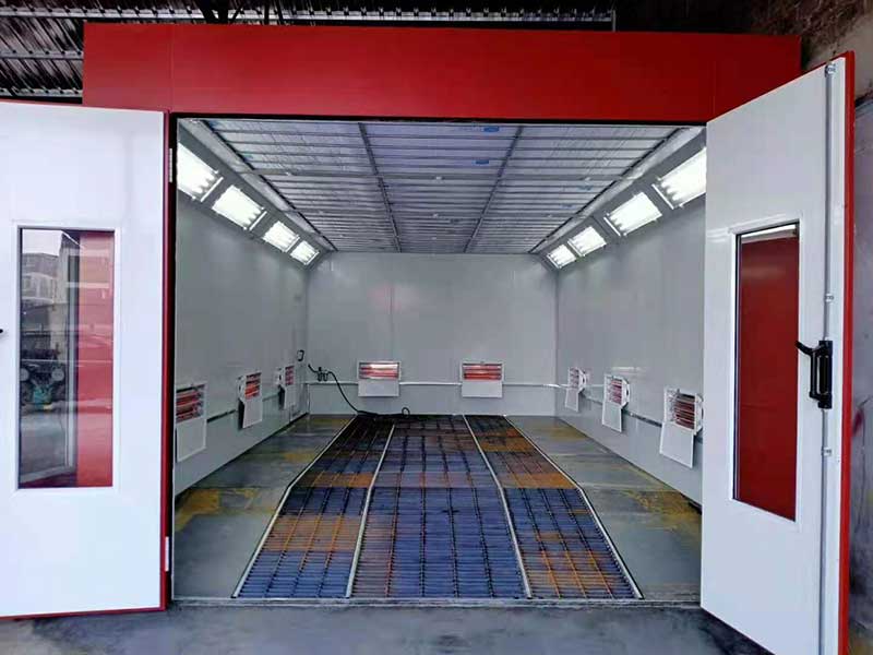 二、 烤漆時,將風門調至烤漆位置,熱風循環,烤房內溫度迅速升高到預定干燥溫度(55℃—60℃)。風機將外部新鮮空氣進行初過濾后,與熱能轉換器發生熱交換后送至烤漆房頂部的氣室,再經過第二次過濾凈化,熱風經過風門的內循環作用,除吸進少量新鮮空氣外,絕大部分熱空氣又被繼續加熱利用,使得烤漆房內溫度逐步升高。當溫度達到設定的溫度時,燃燒器自動停止;當溫度下降到設置溫度時,風機和燃燒器又自動開啟,使烤漆房內溫度保持相對恒定。***后當烤漆時間達到設定的時間時,烤漆房自動關機,烤漆結束。